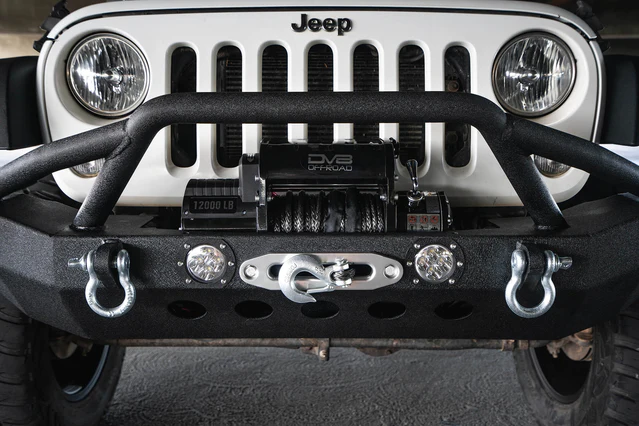 The DV8 Offroad FS-8 Jeep Front Bumper is a heavy duty mid-sized bumper that includes a bull bar and is winch-ready. The bull bar includes light mounts that can mount a 12-inch LED Light Bar.
